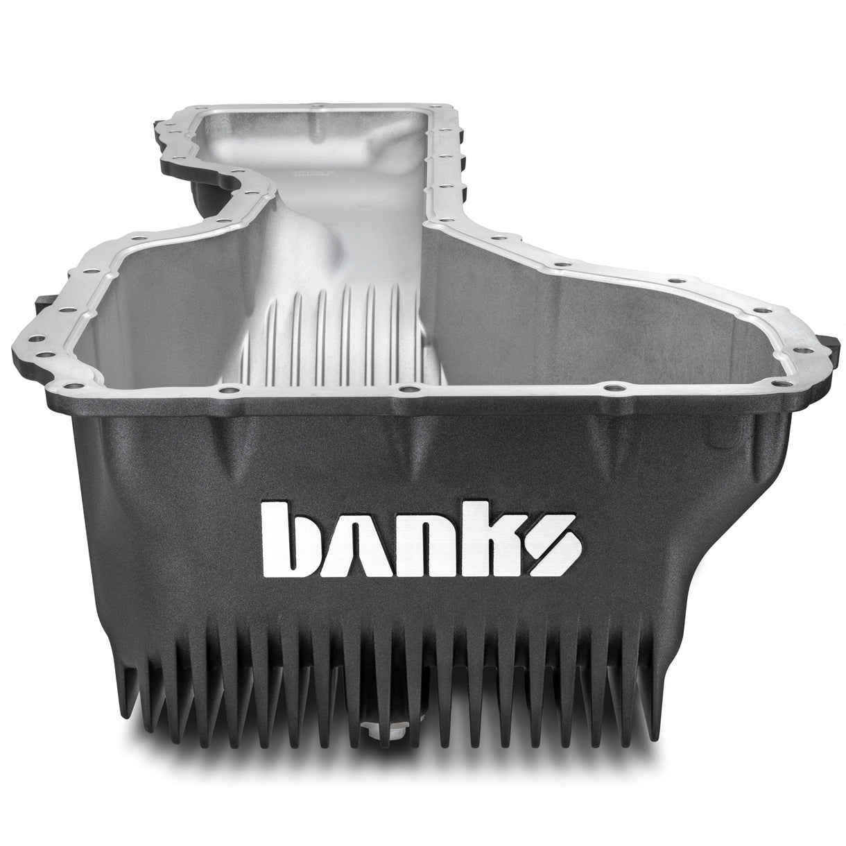 Banks CoolRunner Oil Pan utilizes technology from our military engine program to extend oil life. The system rejects more heat and reduces aeration better than stock and all competitors. Two additional quarts of oil and Banks FlowThru Fins aid in cooling. Unlike stock, the CoolRunner allows all fluid to drain during oil changes.