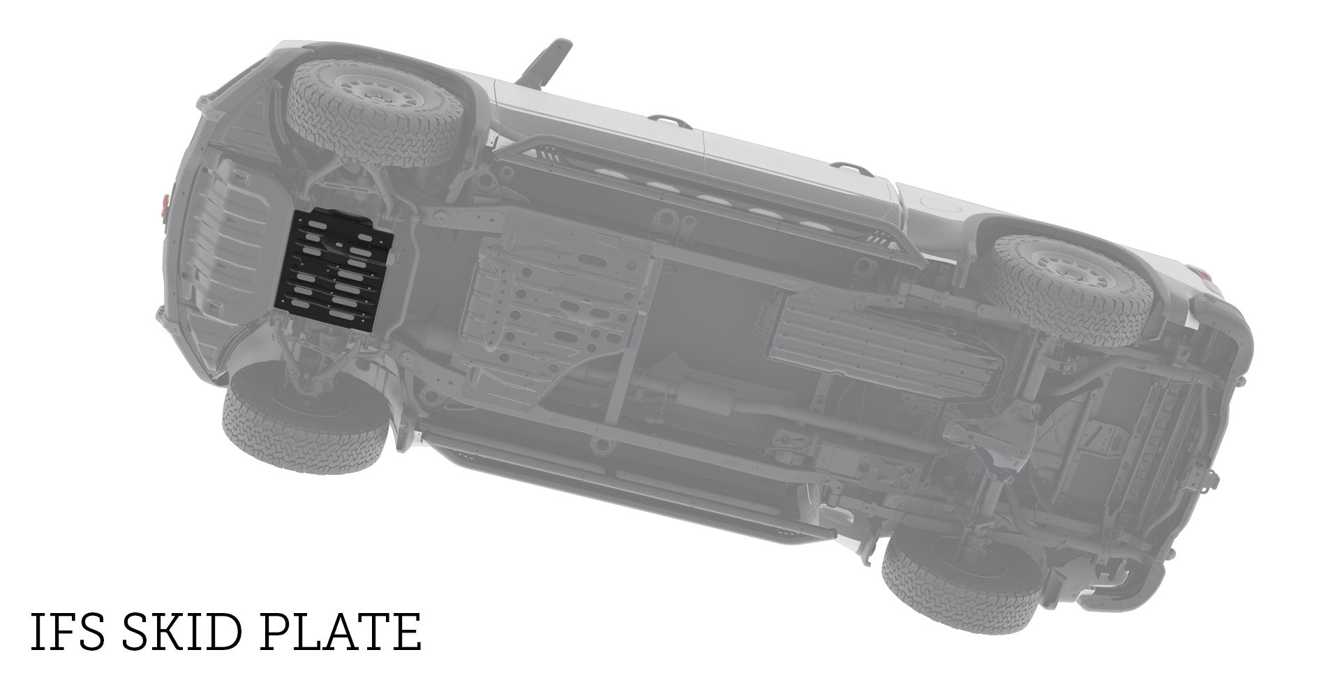 2.5mm Hot-Stamped Boron Steel construction. The AEV IFS Skid Plate shields the front axle and steering gear suspension from unexpected impacts without sacrificing ground clearance. Compatible with all 2019 + 4WD Silverado 1500 & Sierra 1500 models.