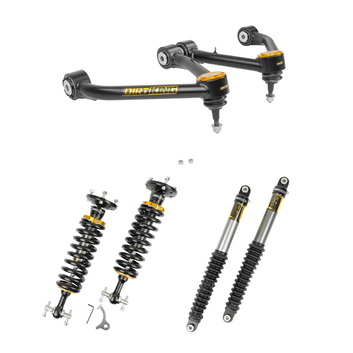 Transform your GM 1500 by eliminating front-end rake and achieving a leveled lift with the Dirt King MT Trail Runner Kit. This cost-effective solution includes Dirt King's 4130 Upper Control Arms, 2.0 IFP Front Coilovers, and 2.0 IFP Rear Shocks—all expertly tuned for superior comfort during everyday driving and on rugged trails. It's the perfect choice for those looking to enhance their vehicle's appearance and ride quality without the premium price tag of an extreme off-road package. For unmatched off-road control, adjustability, and high-speed desert capability, consider our MT PreRunner Kit.