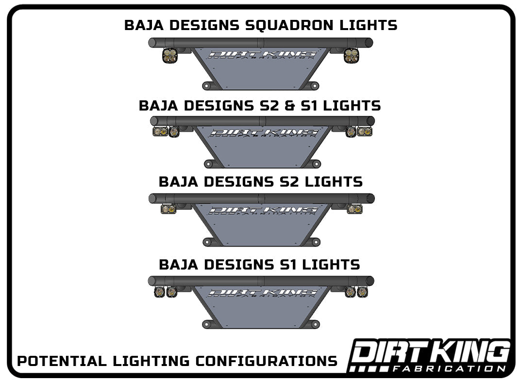 The Dirt King prerunner bumper is a perfect addition to any off-road Silverado 1500 or Sierra 1500. It gives the front end that finishing touch as well as providing a strong structure to withstand the punishment seen in off-roading. The bumper is CAD designed and constructed with DOM tubing. We offer several options allowing you to customize it to your preferences. The standard bumper comes raw metal with an aluminum Dirt King skid plate. This bumper bolts into the factory holes on the frame and works with a trimmed factory bumper shell or our high clearance fiberglass bumper shell. Most 2016-2018 Silverado's didn't come equipped without fog lights so we offer the correct bumper shell that can be purchased along with the tubular bumper. If you plan on installing this bumper with the Fiberwerx fenders and valance you will need to custom mount lights to fill the void. Returns or cancelations on powder coated bed cages are subject to a 10% restocking fee.